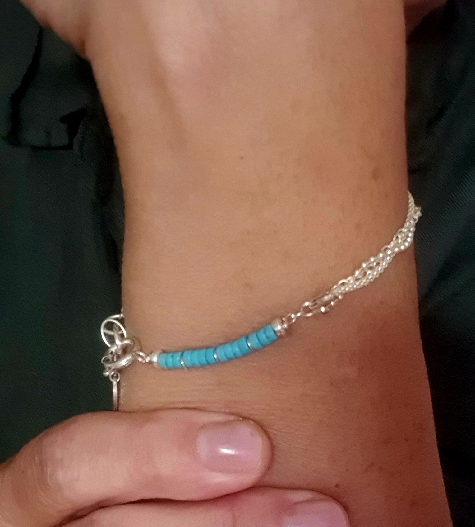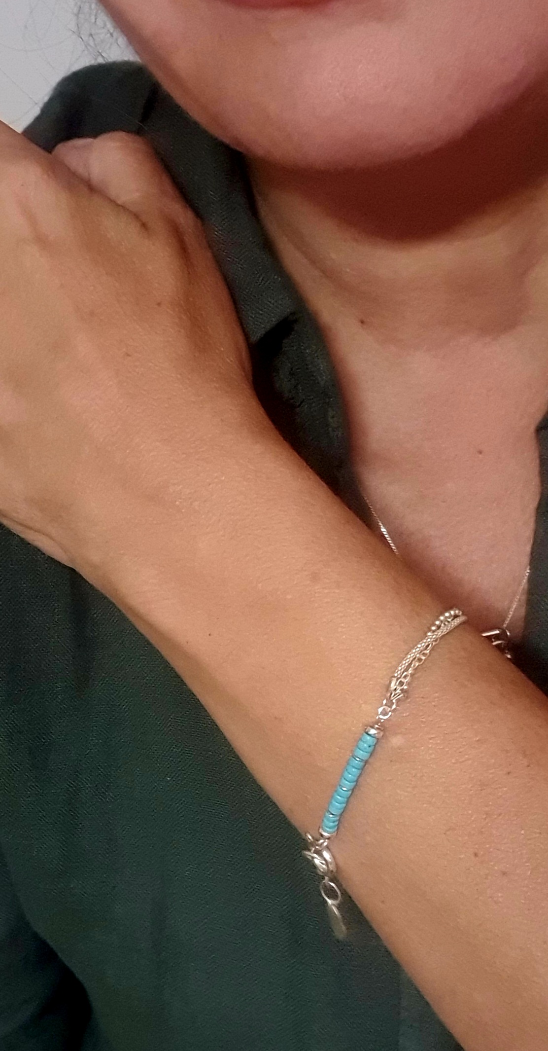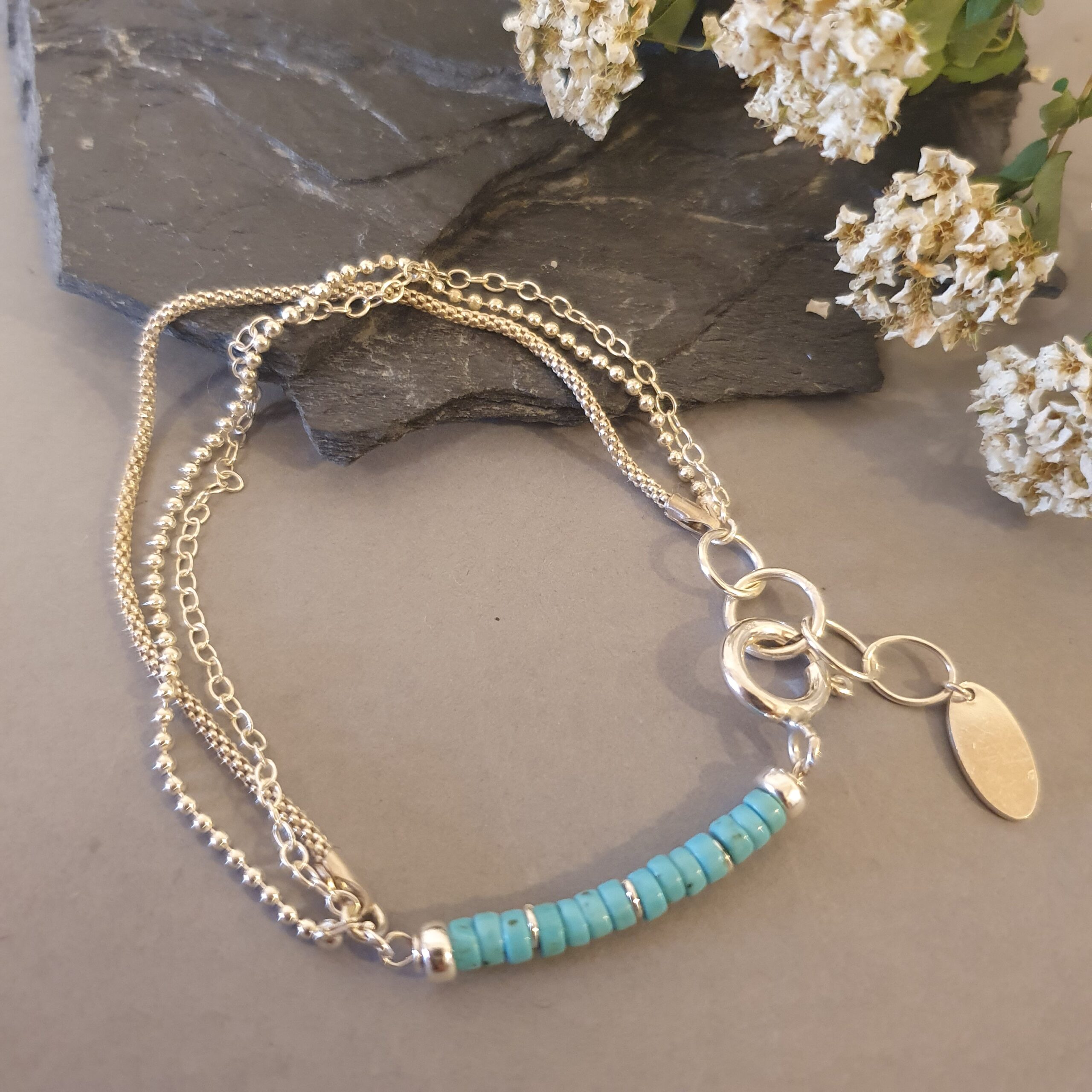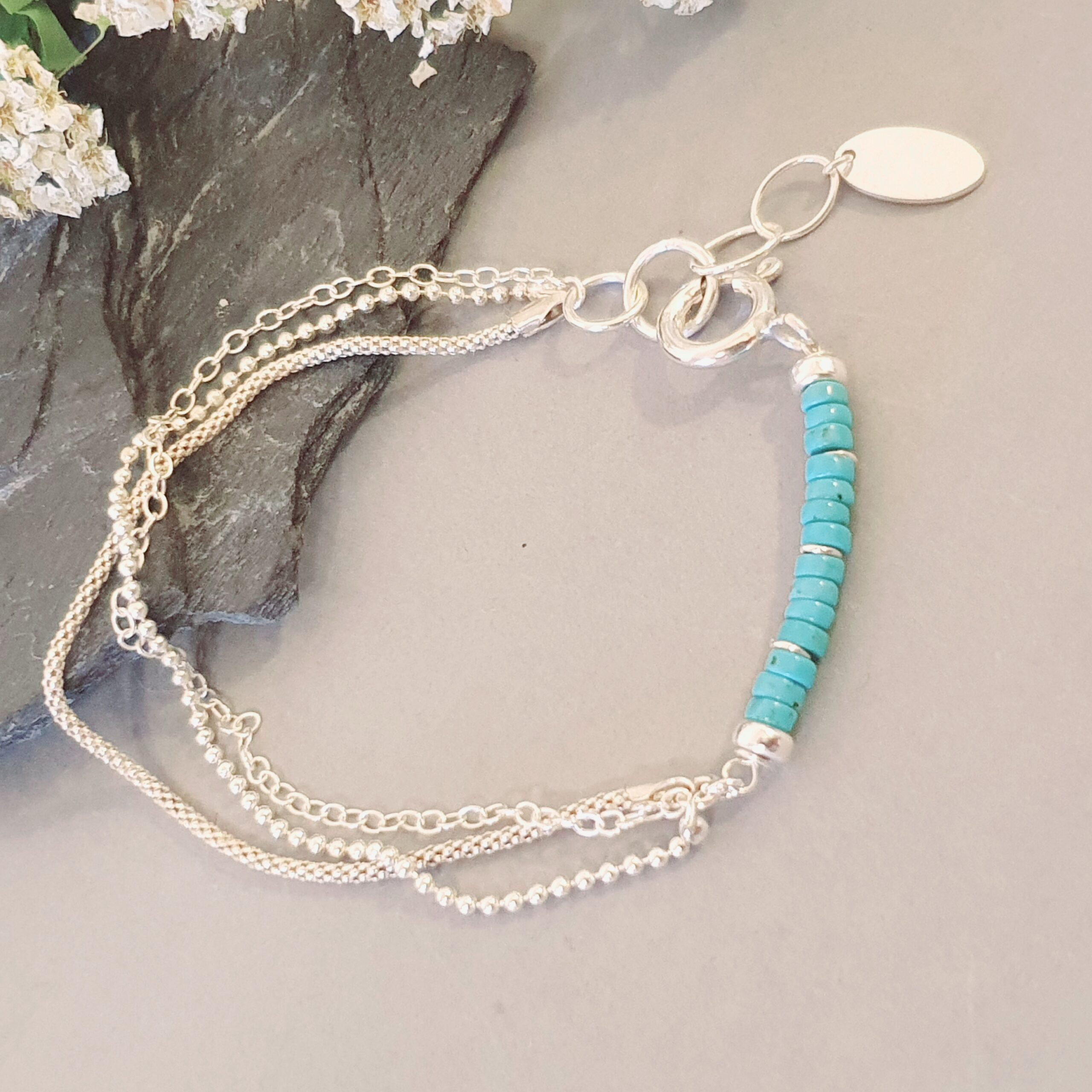 Elegant, a lightweight layered bracelet made of 925 sterling silver, adorned with natural with turquoise and a decorative a coin-shaped charm – parabolaThree delicate chains create a fashionable yet timeless effect of classic jewelry.