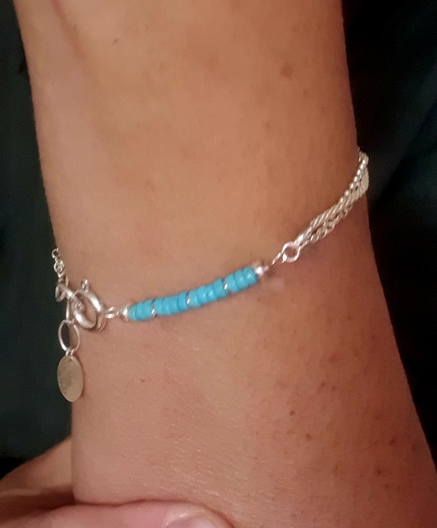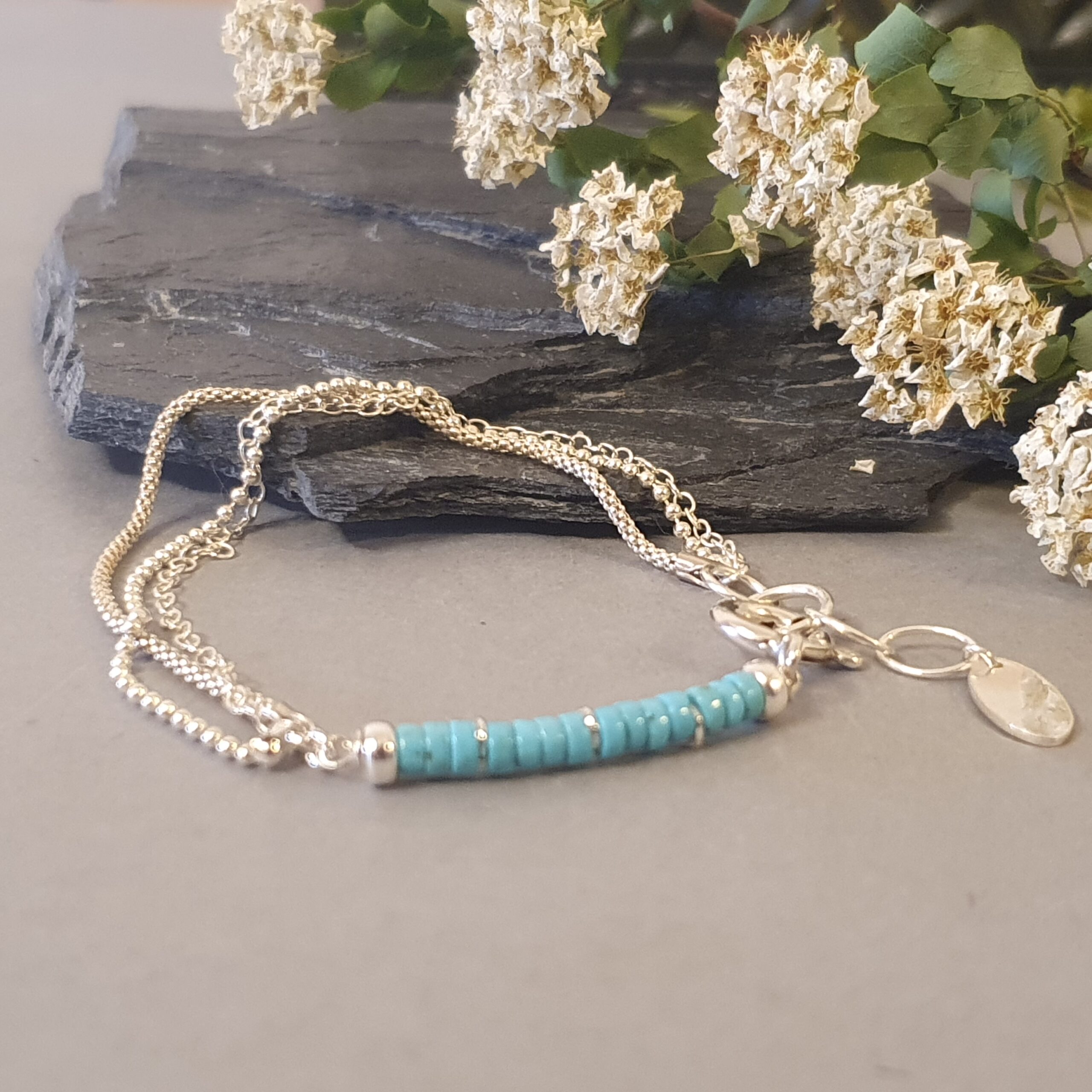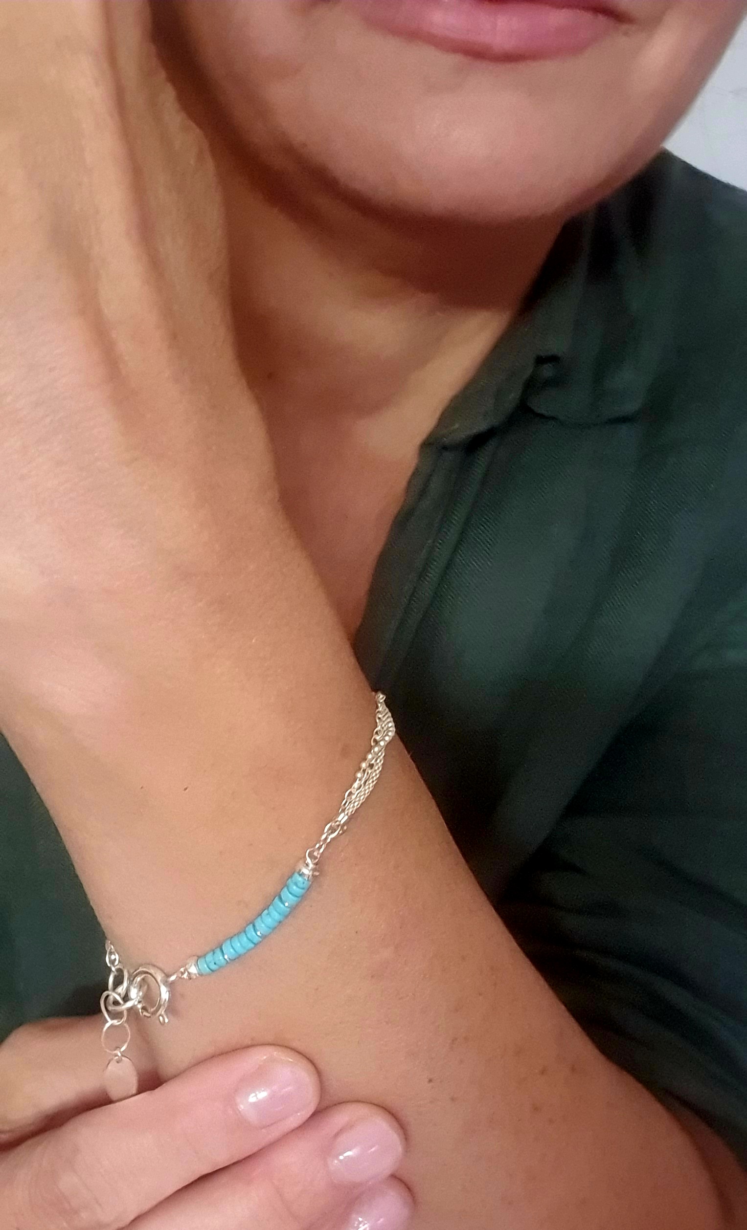 Turquoise stones measuring 2 × 4 mm beautifully contrast with the cool shine of silver, giving the bracelet a fresh, summery character. The whole design is completed by a disc-shaped charm – parabola, measuring 12 × 6 mm, which subtly reflects the light.