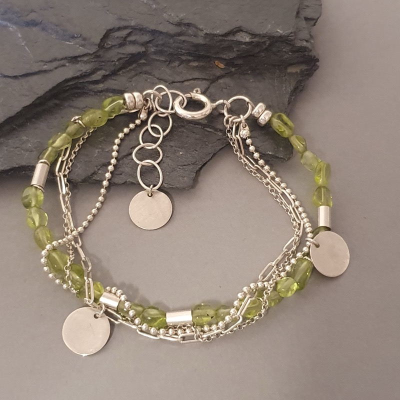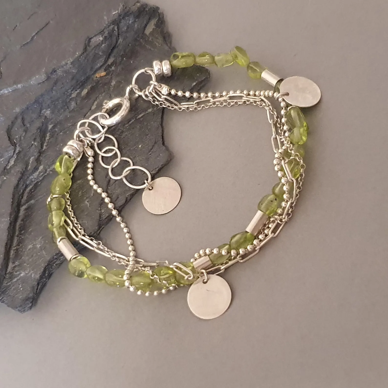Layered 925 sterling silver bracelet with natural peridots and silver discs