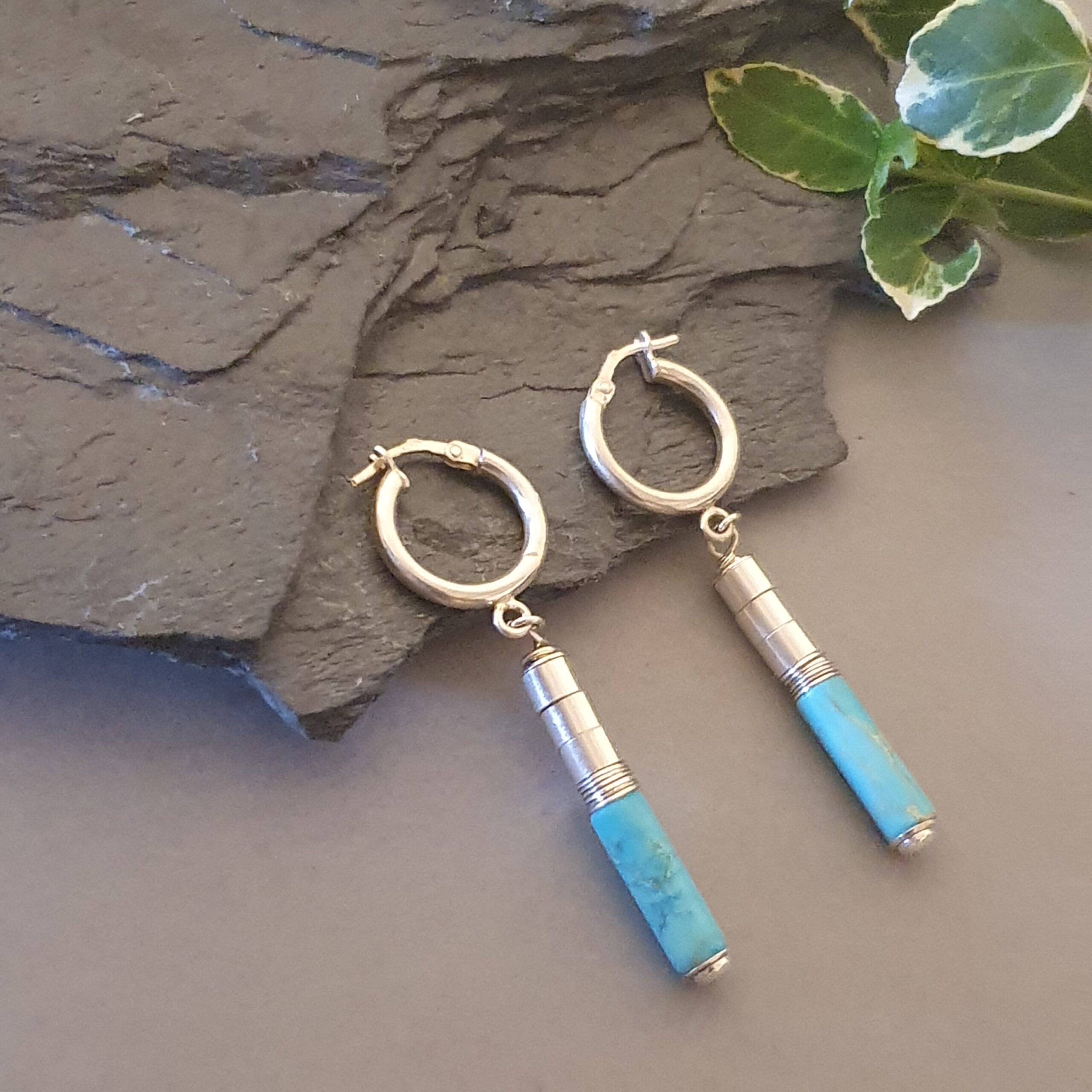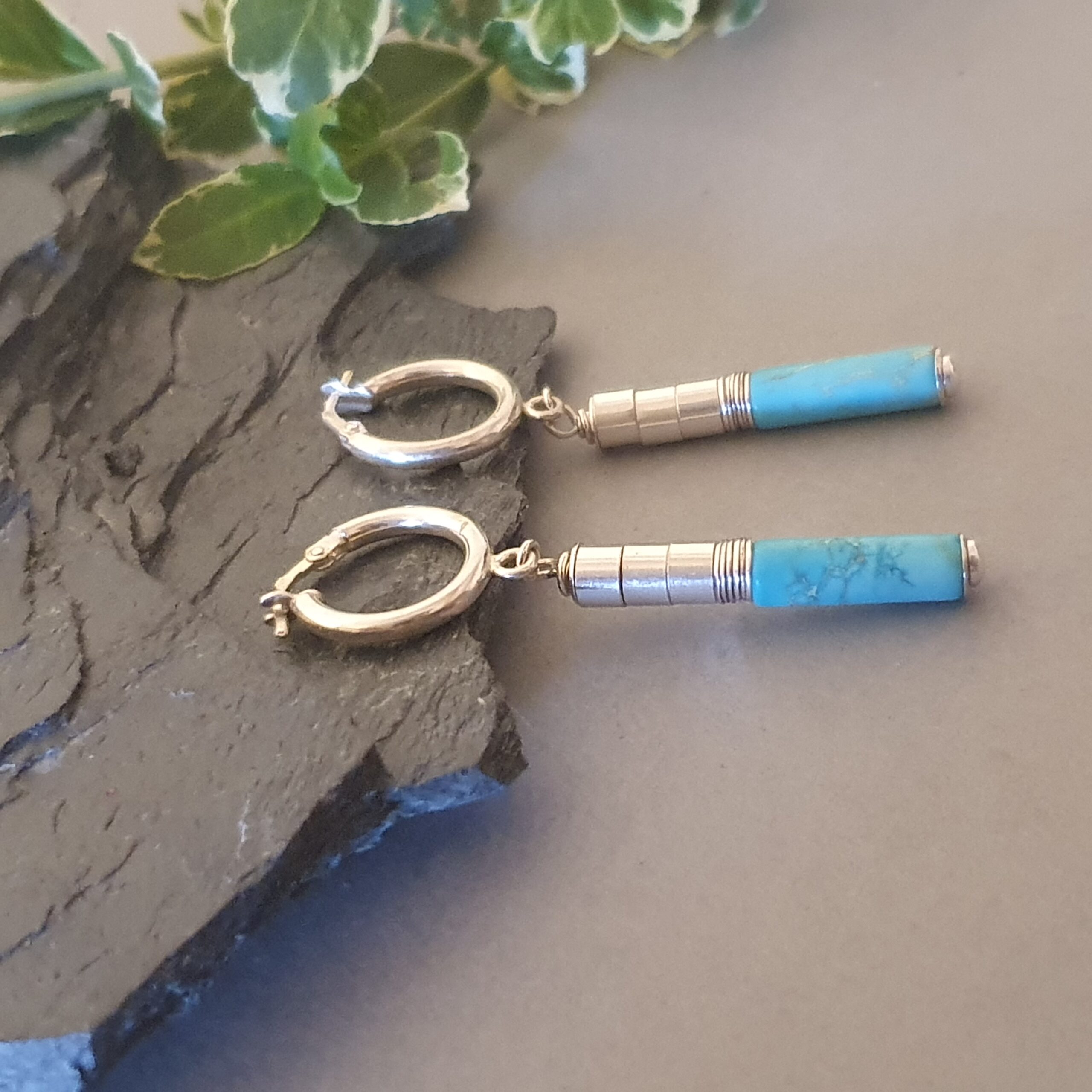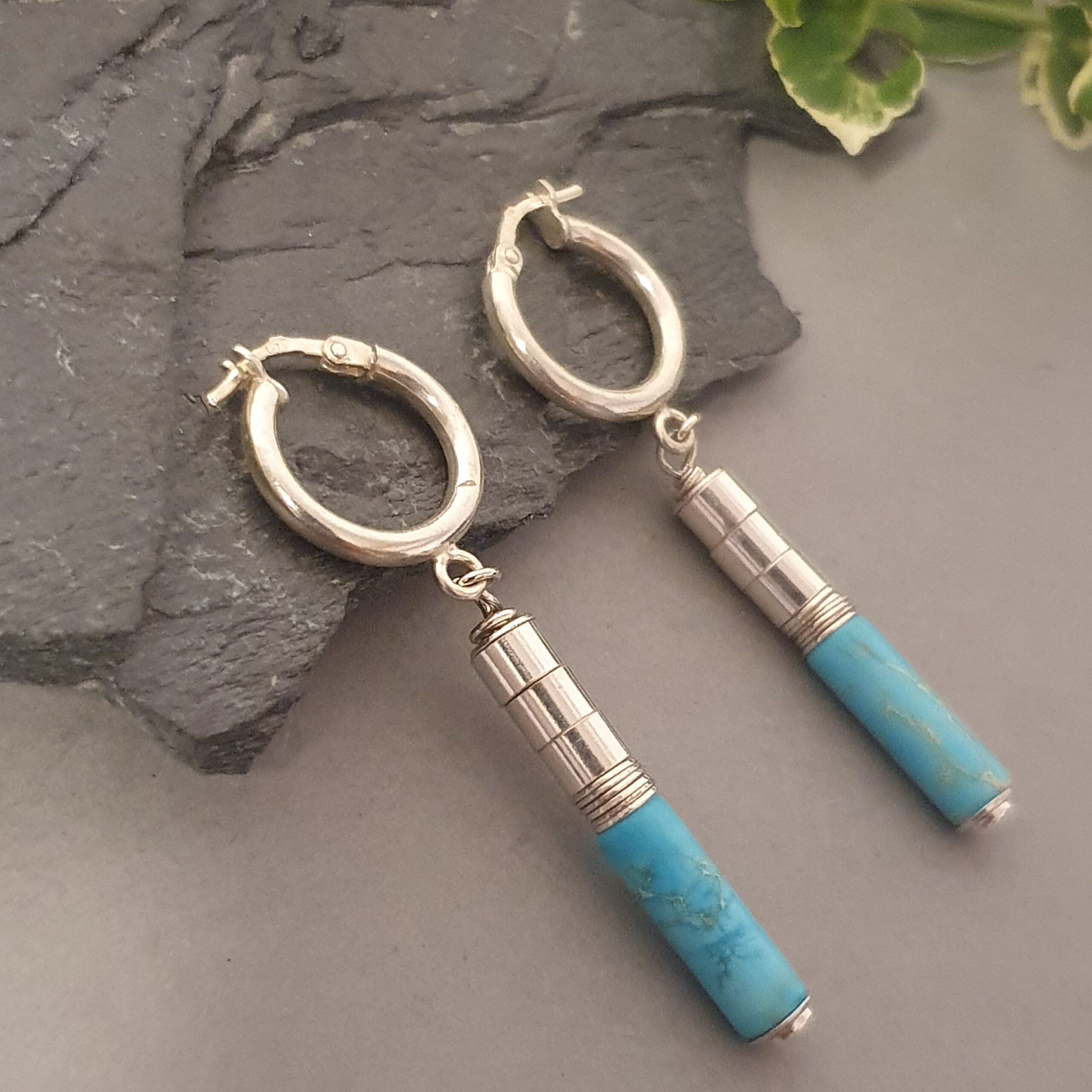 Subtelne, a jednocześnie wyraziste kolczyki wykonane ręcznie ze srebra próby 925, ozdobione naturalnym turkusem w formie długiej, smukłej tuby (ok. 14 × 4 mm). To biżuteria, która łączy nowoczesną prostotę z ponadczasowym urokiem kamieni naturalnych.
