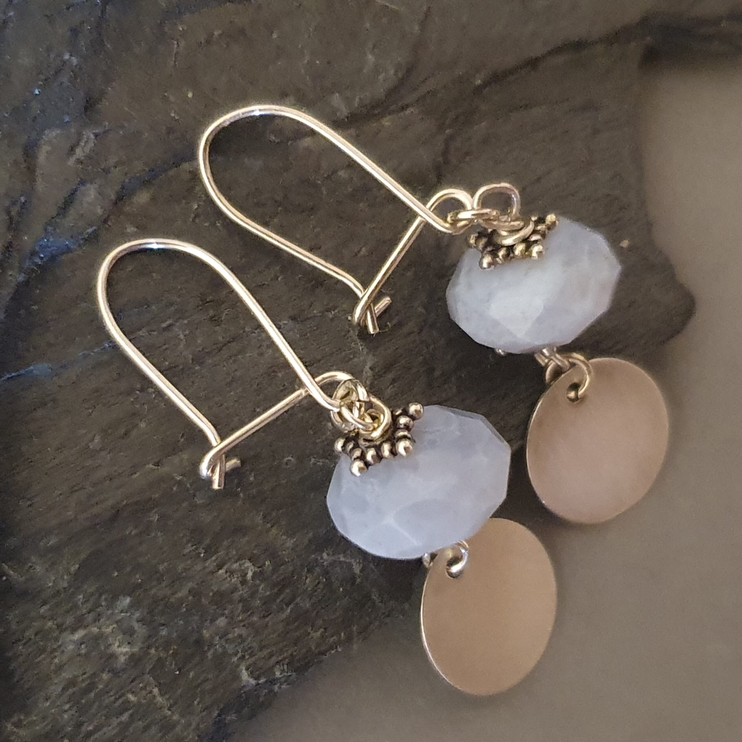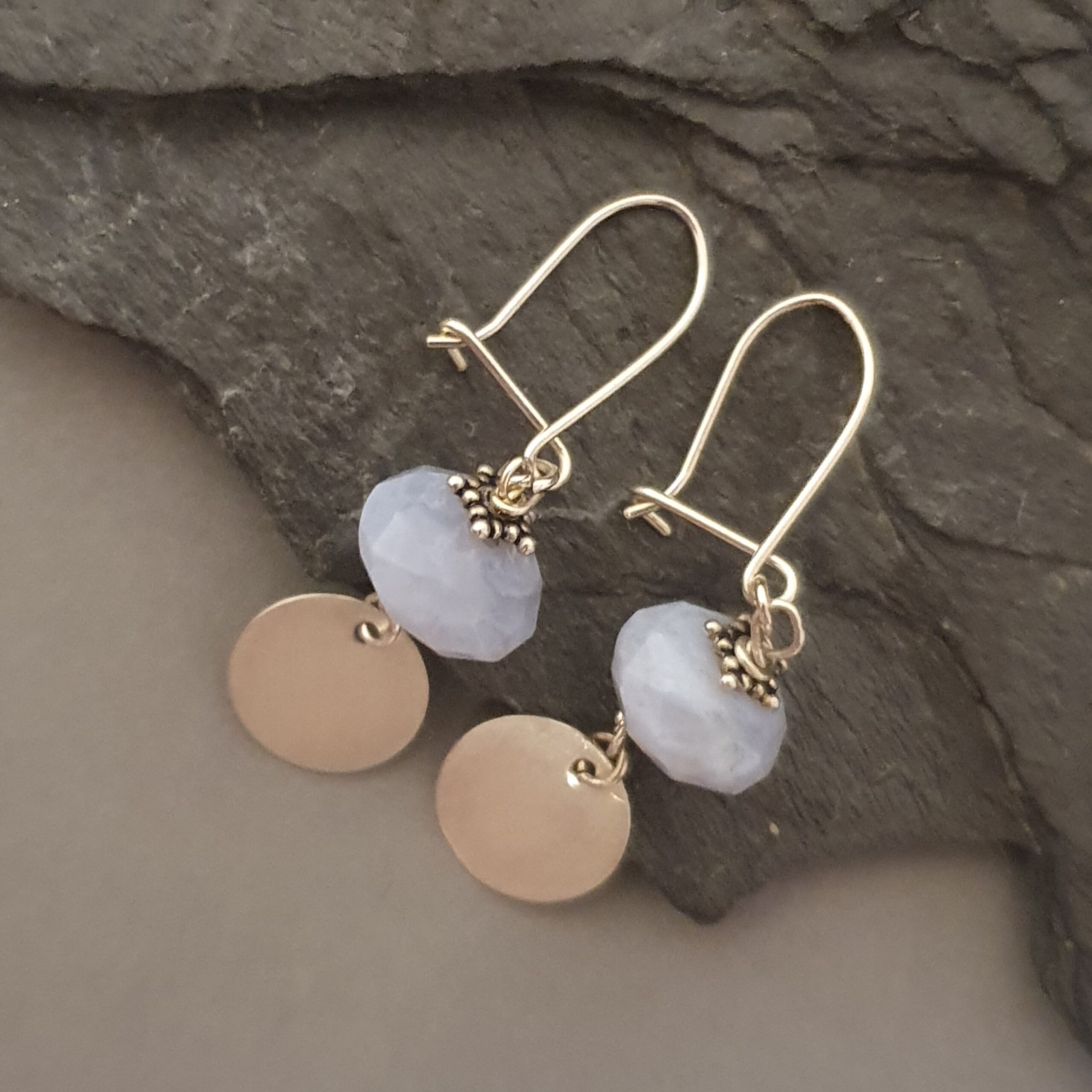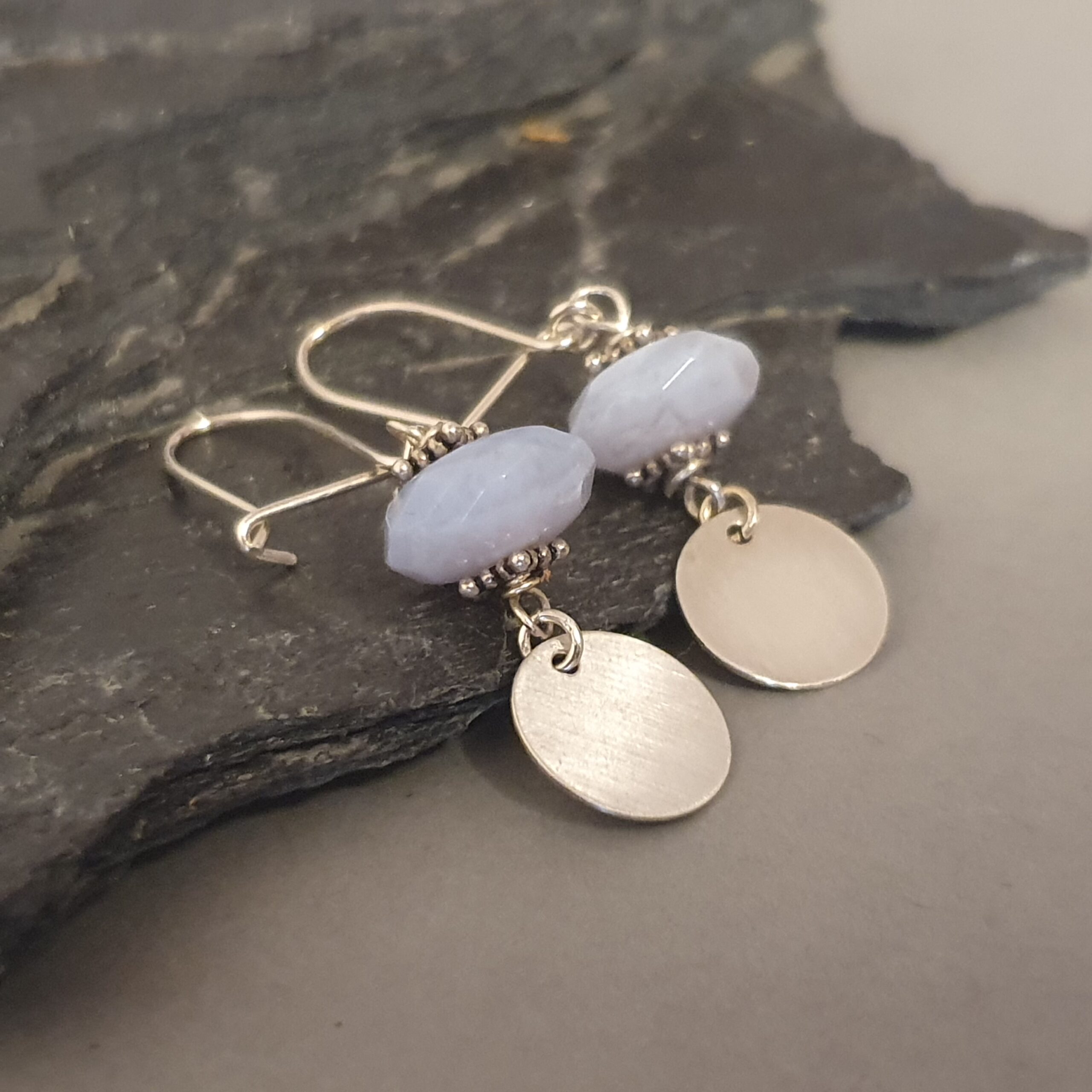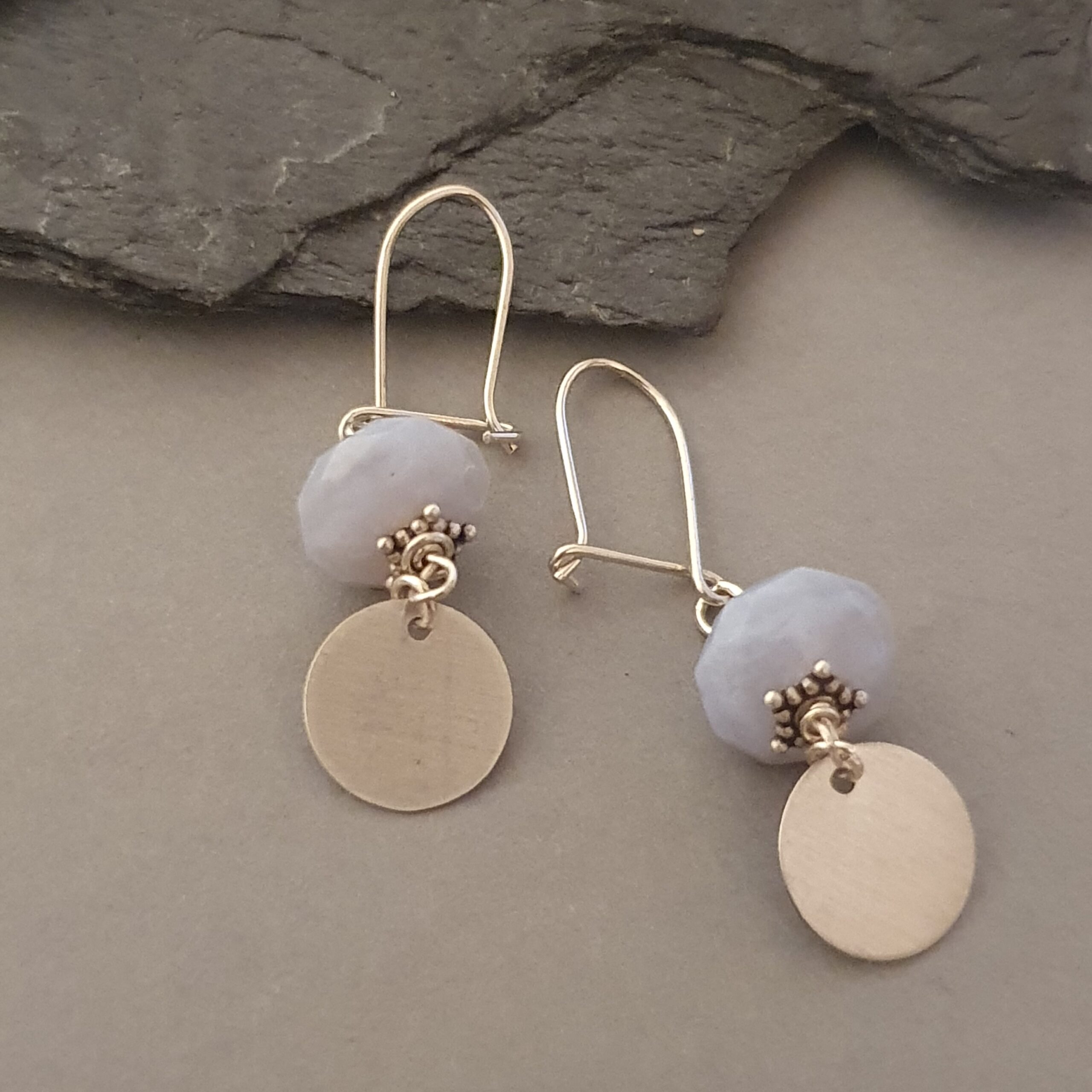 Delikatne, srebrne kolczyki z naturalnym kyanitem i ozdobnym srebrnym krążkiem. Lekkie, eleganckie i kobiece — idealne do codziennych stylizacji i na prezent.