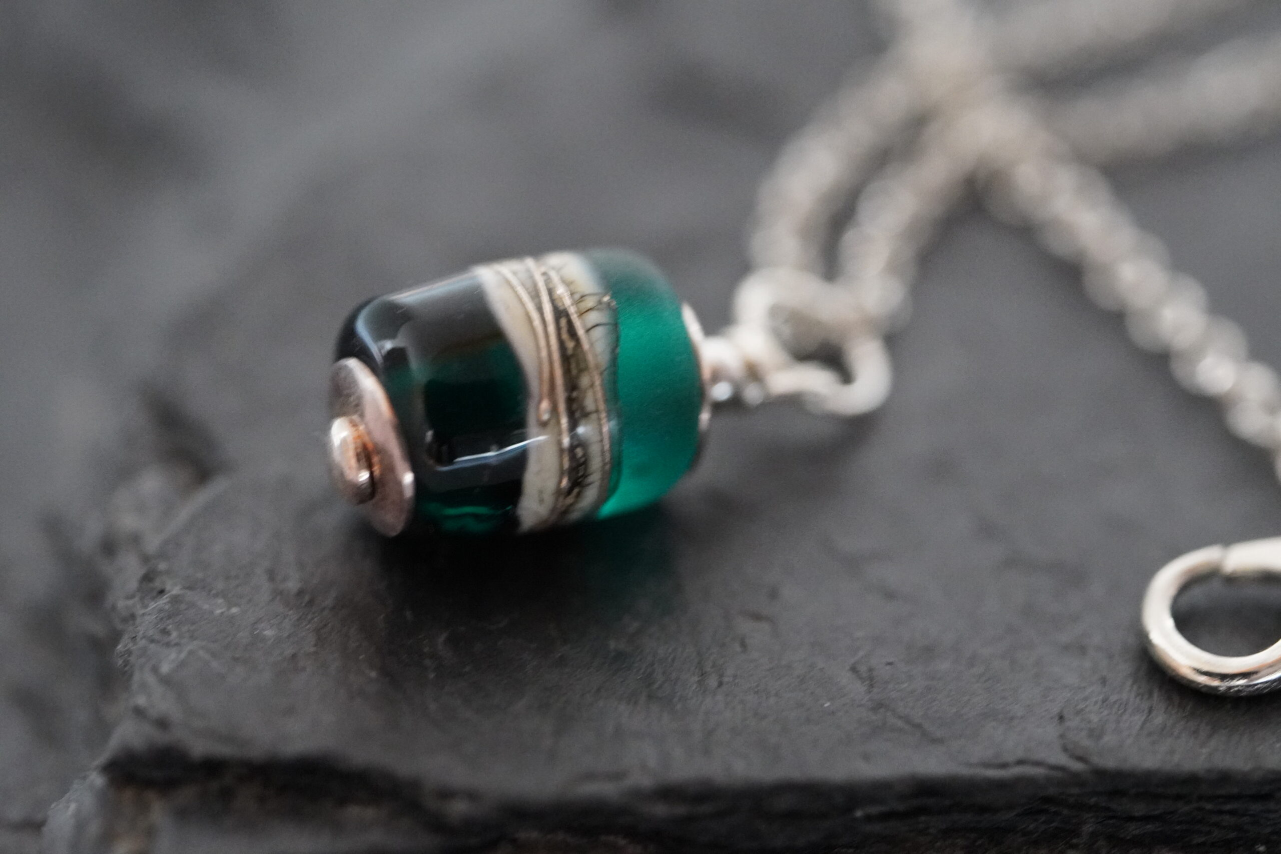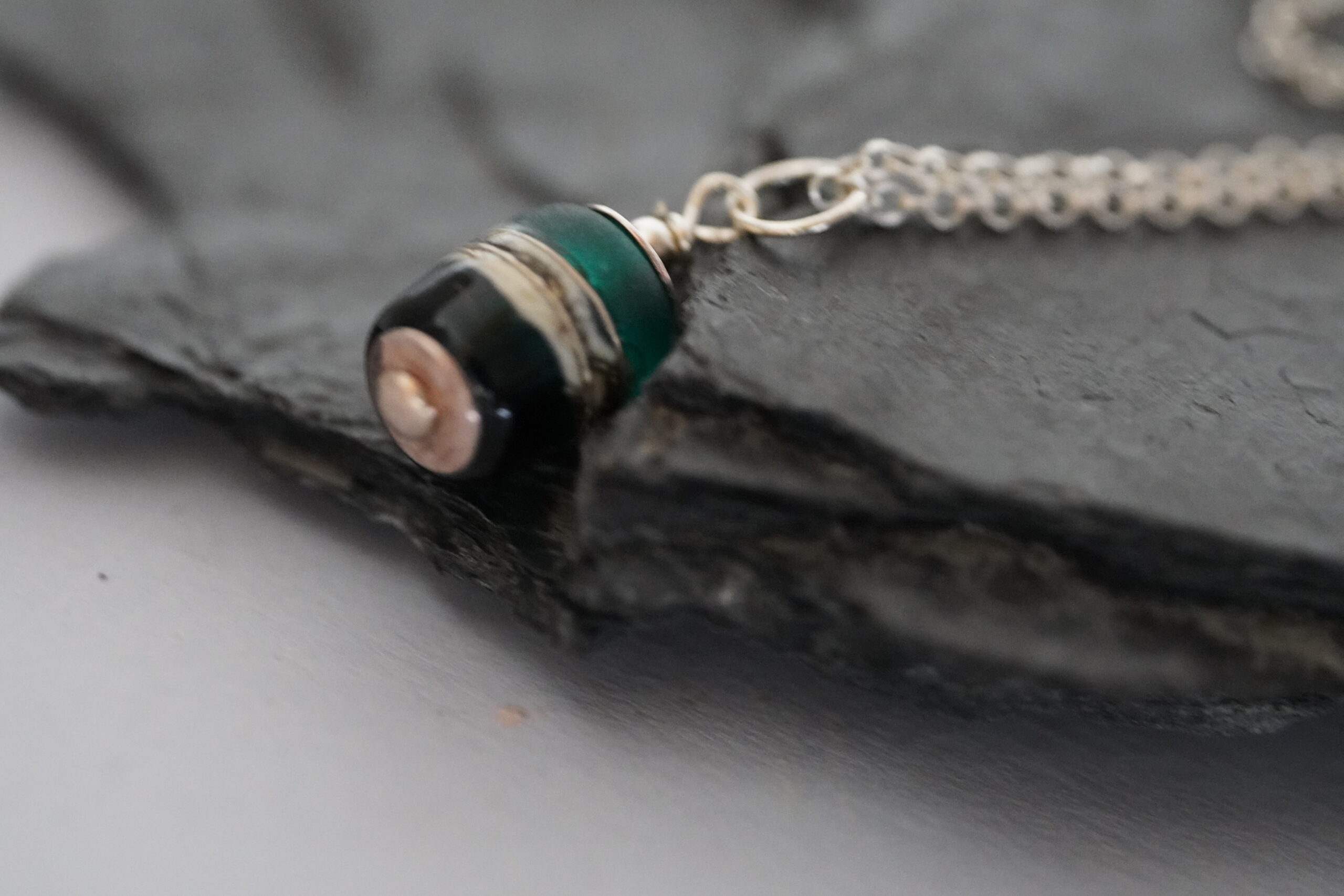 Ręcznie wykonany naszyjnik z unikatowym koralikiem lampwork w subtelnych, seladynowych odcieniach, który zachwyca głębią koloru i delikatnymi przejściami barw. Szklany koralik powstał w technice lampwork, dzięki czemu każdy egzemplarz jest niepowtarzalny i posiada swój indywidualny charakter.