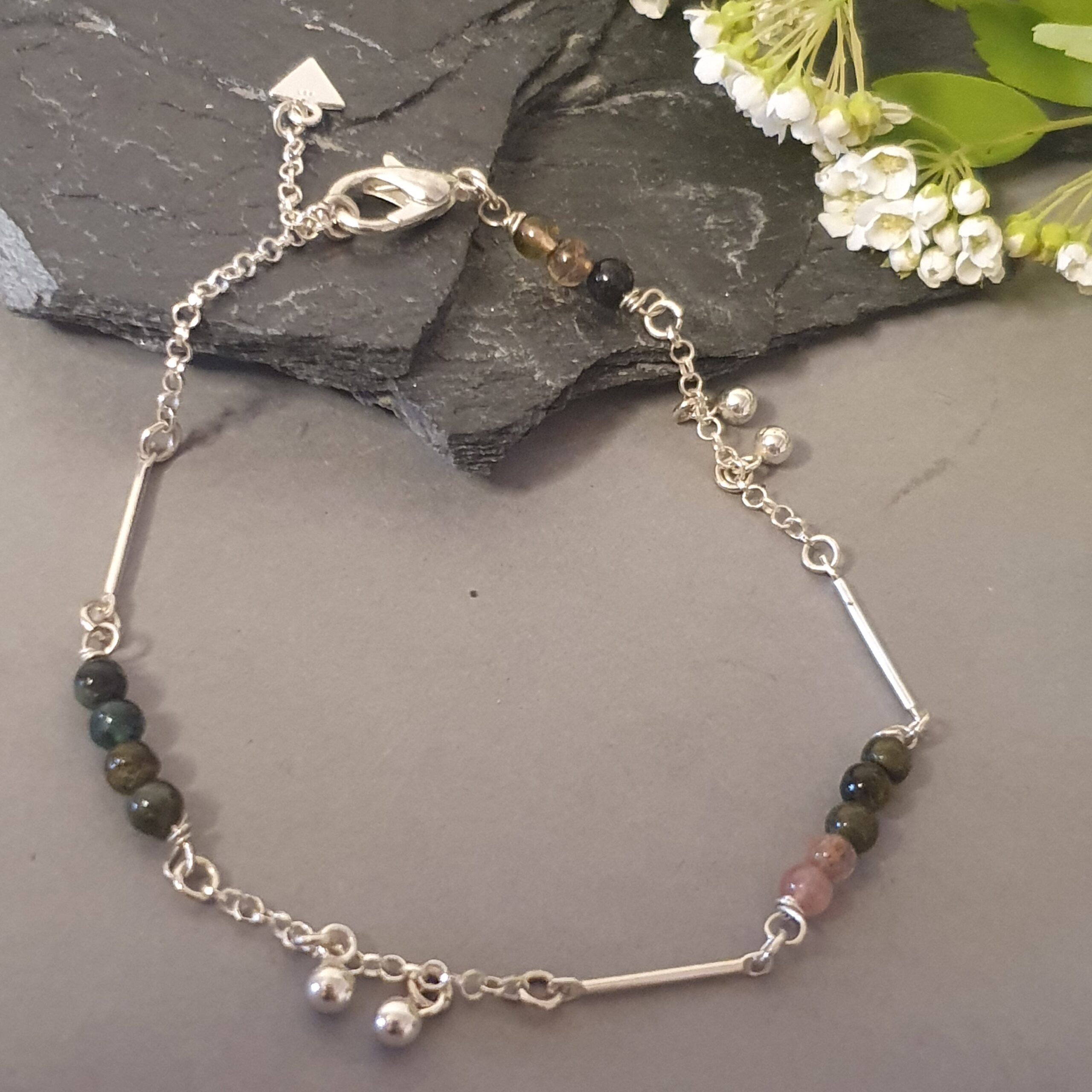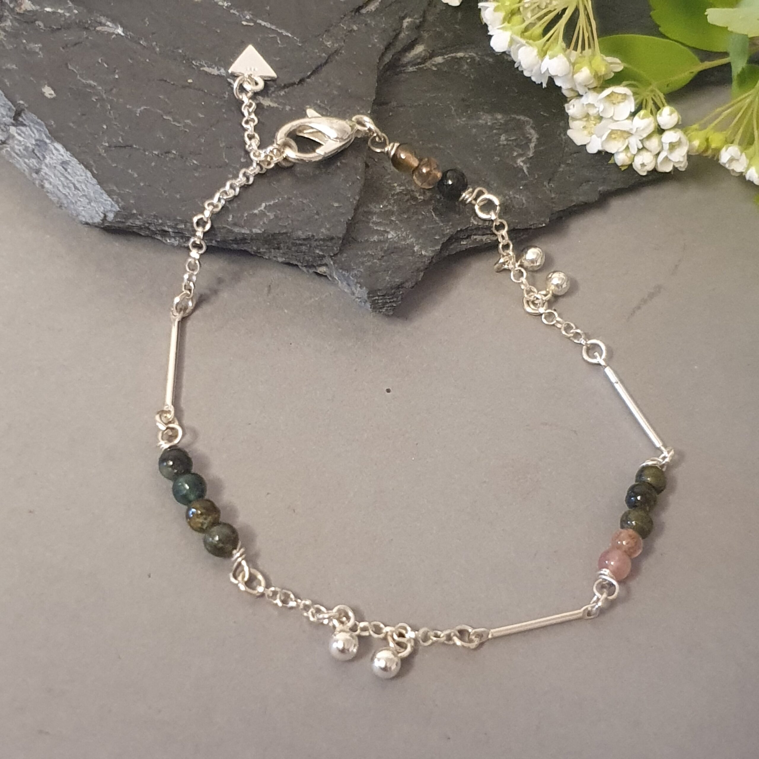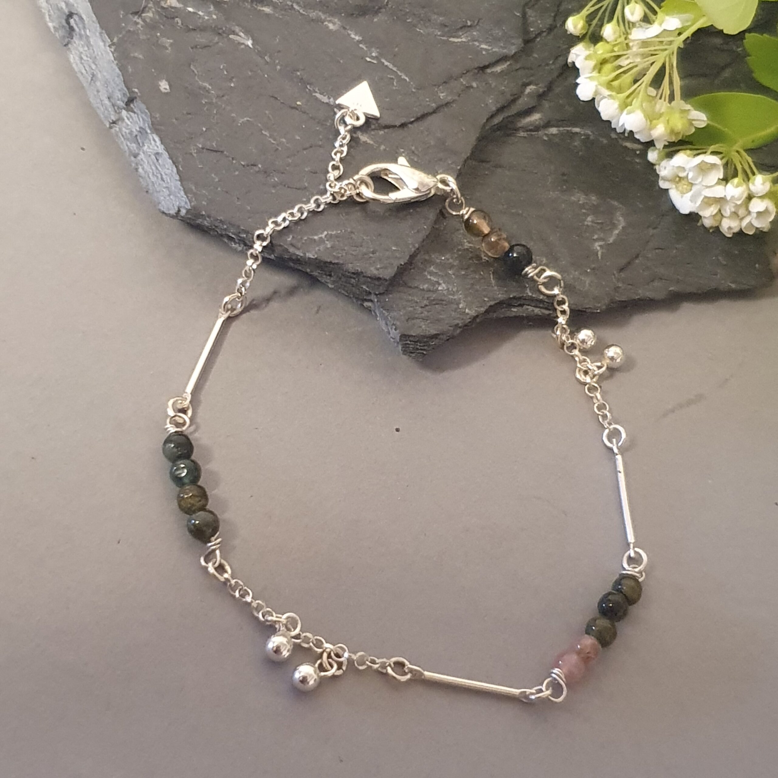Subtelna srebrna bransoletka 925 z oliwkowym turmalinem i małą zawieszką trójkąta.