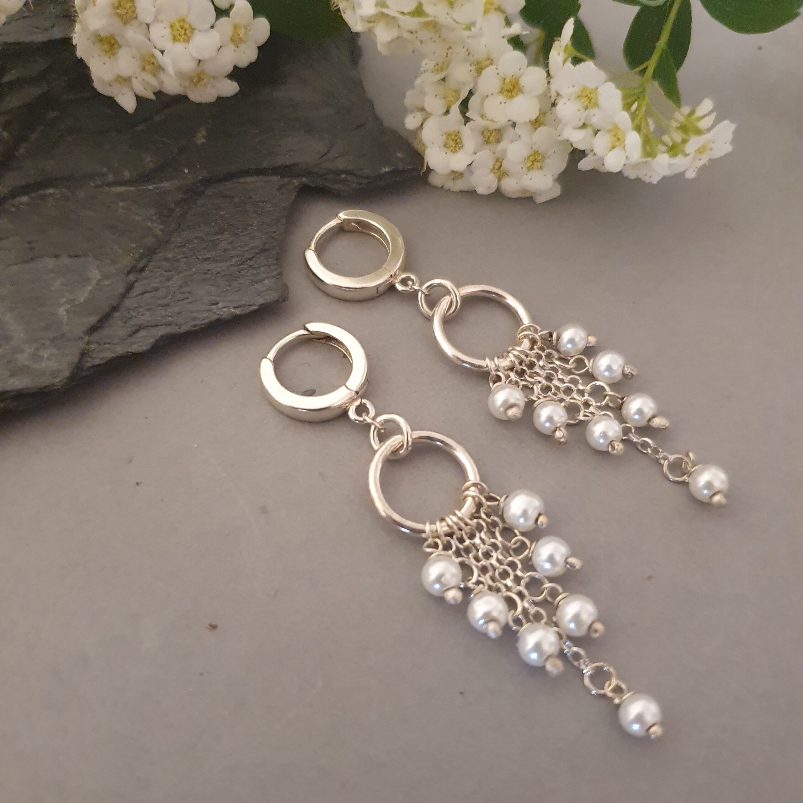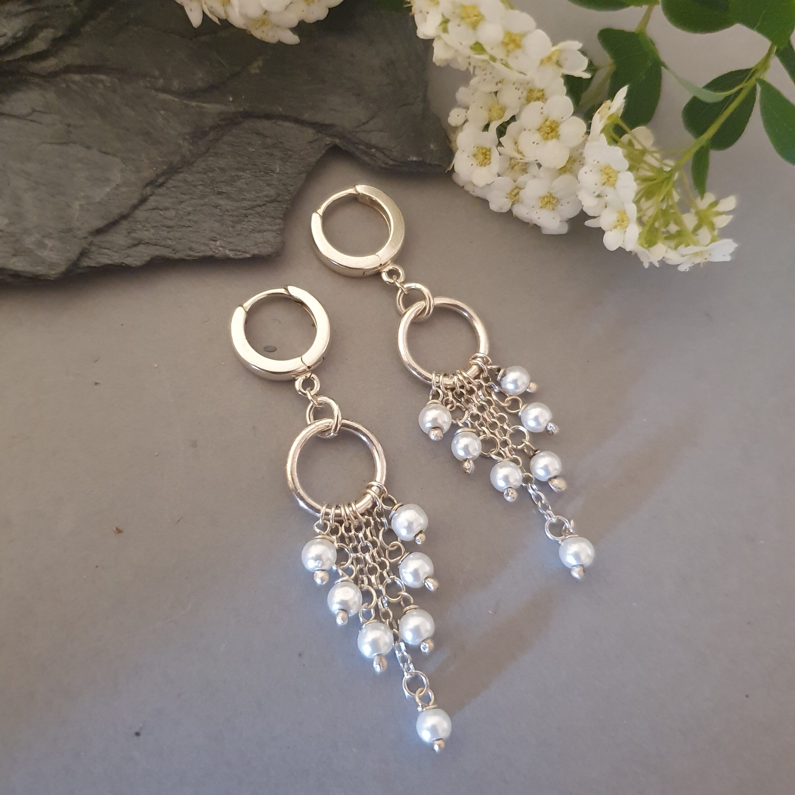 Te subtelne, ręcznie wykonane kolczyki ze srebra próby 925 łączą w sobie klasyczną elegancję pereł z nowoczesną formą. Delikatne frędzle z drobnych, naturalnych perełek słodkowodnych pięknie poruszają się przy każdym ruchu, tworząc efekt lekkości i romantycznego blasku.Centralnym elementem jest srebrne kółko o średnicy 10 mm, z którego zwisają drobne łańcuszki zakończone perełkami. Całość ma biżuteryjną miękkość i subtelną świetlistość, idealną zarówno do codziennych, jak i eleganckich stylizacji.